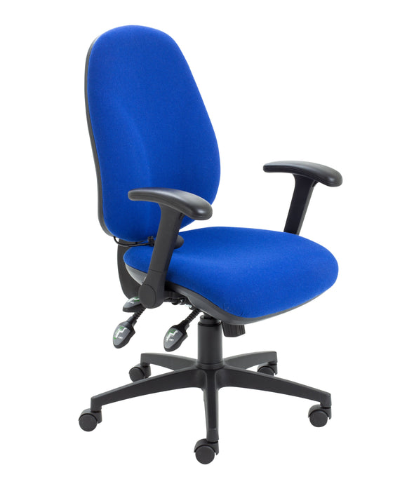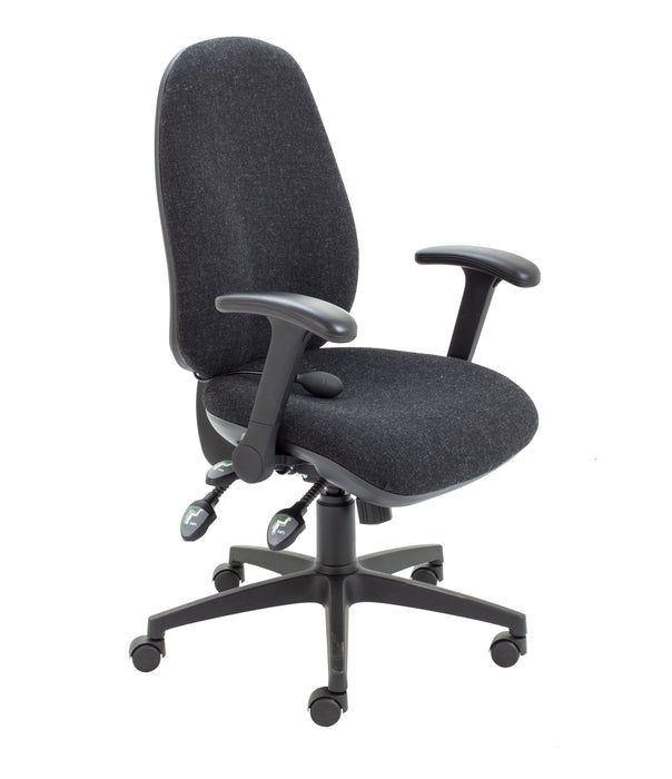 (H)1070 - 1270mm (W) (D)700mmA popular solution to the rigorous demands of any office environment, this range has been tested to BS 1335 (2000) Part 2. A high back operator chair with contoured back, inflatable lumbar pump and Asynchro torsion mechanism. Heavy duty thick foam office chair for up to 8 hour use and users up to 115 kg Large seat, shaped kidney foam with an inflatable lumbar pump for support Integral seat slide and ratchet back to accommodate all users A range of arms are available - fixed, height adjustable and folding Backrest and seat angle can be fixed or set to free float in 2:1 ratio Tested to BS 1335 (2000) Part 2 certification Suitable for users up to 115 kg